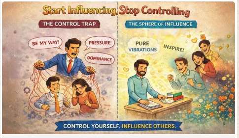 Whenever we complain about someone not being our way, we essentially imply that if we could control them, we could have guaranteed right results. The truth is we cannot control anyone, but we can influence literally everyone. Control radiates dominance, influence radiates care. Do you live with or work with someone who uses control tactics to change you? Have you also met people who have inspired you to change, just by being who they are? Let us accept that people will not be our way. Maybe they see nothing wrong with themselves, or they disagree with us, or they don’t want to change. Exerting control or pressurizing people to change their habits or behaviors is never a solution. If we do that, people repel us, leaving no chance for them to listen to us. Our sphere of control owing to position, seniority or role is limited. But our sphere of influence through our personality is infinite. When we consistently live the right way and when we consistently bless them instead of feeling irritated about them, our vibrations radiate to them. Our pure energy empowers and influences them to change. Start connecting with people with acceptance and respect for who they are. Remind yourself daily - I am a powerful being. People can be their way. I remain my way, the right way and influence them. Letting people be their way, I influence their habits and behaviors with my perfection and pure intention. Look to control yourself and influence others. Bring your cheerful energy into every interaction. Listen to others, intuitively understand others, highlight their potential, give them a sense of purpose, guide them to achieve their goals. Being naturally motivated and wise, inspire everyone to bring out their best, appreciate and celebrate their success. Even if they fail to listen to you or fail to achieve, guide them and encourage them to try again. Lead by example. If someone is not your way, do not get disturbed. Empathize and influence them with your stability and unconditional acceptance.